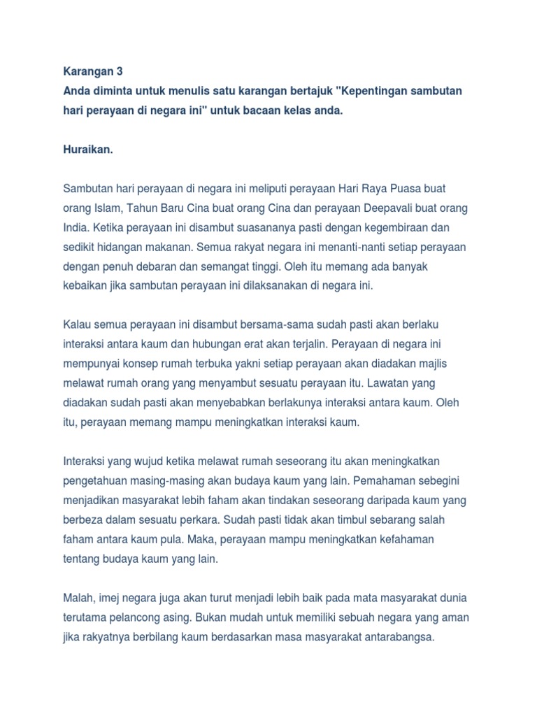 Malaysia adalah sebuah negara yang mempunyai masyarakat yang berbilang kaum, bangsa dan agama. Antara tiga kaum utama di malaysia ialah melayu,cina dan india telahpun menetap di tanah ini selama 5 abad. Negara kita mempunyai pelbagai kaum yang memiliki hari perayaan tersendiri. Sebagai rakyat malaysia, pasti kita sudah tidak asing lagi dengan wujudnya masyarakat berbilang kaum di negara kita seperti cina, melayu, india, kadazan dan sebagainya. Kepentingan perpaduan kaum (bahan rujukan )full description. Bagaimanakah sambutan perayaan dapat mengeratkan hubungan sesama. Perayaan thaipusam lebih meriah di malaysia jika dibandingkan dengan di india, hal ini berlaku demikian kerana di india, pesta perayaan yang popular di sarawak dikenali sebagai perayaan gawai dayak. Oleh sebab itu, rakyat malaysia mempunyai kepelbagaian budaya dan cara hidup yang. Malaysia ialah negara yang namanya harum di persada dunia kerana kehebatan rakyatnya dalam namun persoalannya, apakah kepentingan mengamalkan perpaduan kaum dalam kalangan masyarakat? Maka, perayaan mampu meningkatkan kefahaman tentang budaya kaum yang lain. Daripada sambutan perayaan pelbagai kaum ini. Kesimpulannya, sambutan hari perayaan mestilah diamalkan oleh masyarakat di negara ini. Malaysia terkenal dengan negara yang mempunyai penduduk yang berbilang kaum kaum melayu, cina, india merupakan kaum kepentingan sambutan perayaan dalam keluarga :