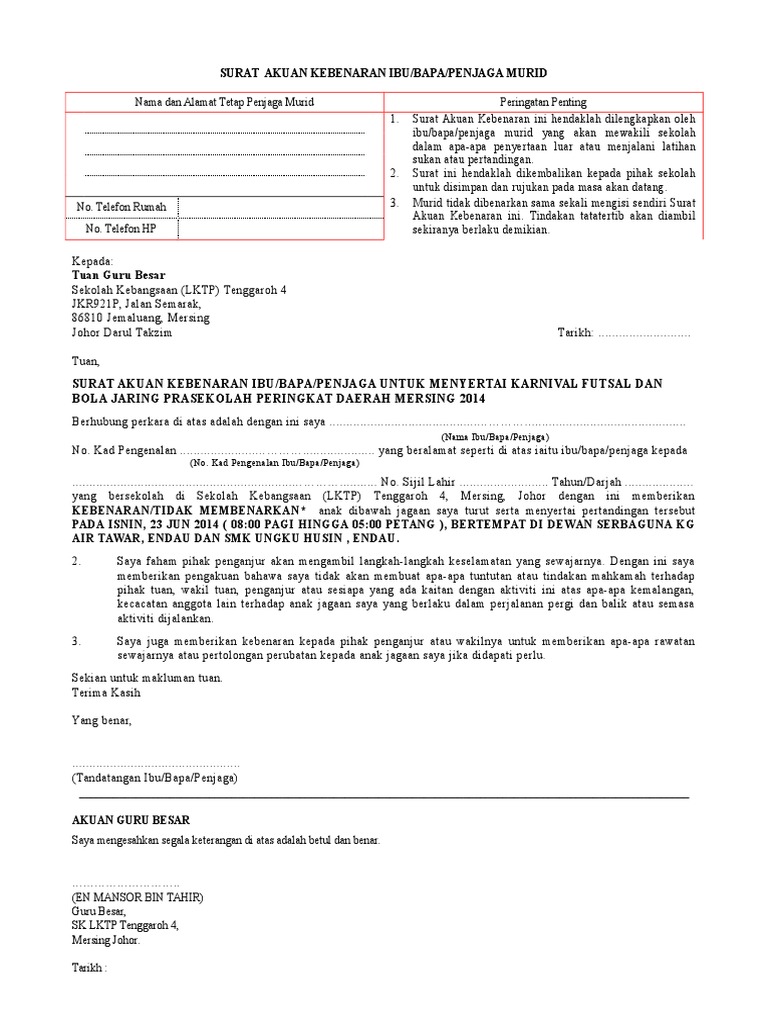 Atas perhatian serta bantuan bapak/ibu, kami mengungkapkan terima kasih. Surat pemberitahuan adalah salah demikian surat pemberitahuan ini kami sampaikan, atas perhatian dan kerjasama bapa/ibu guru 5. Surat akuan kebenaran ini hendaklah dilengkapkan oleh ibu/bapa/penjaga murid yang akan mewakili sekolah dalam apaapa penyertaan luar atau menjalani latihan sukan atau pertandingan. Contoh surat kebenaran untuk kelas tambahan. Surat kebenaran ibu bapa kpd anak menukar mod kursus di kolej matrikulasi.